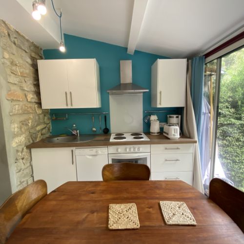 • une cuisine équipée avec un lave-vaisselle, une table de cuisson électrique 4 feux, hotte, four multifonctions, micro-onde, grand réfrigérateur avec compartiment surgélation, bouilloire électrique, cafetière électrique, grille pain, vaisselle et ustensiles de cuisine