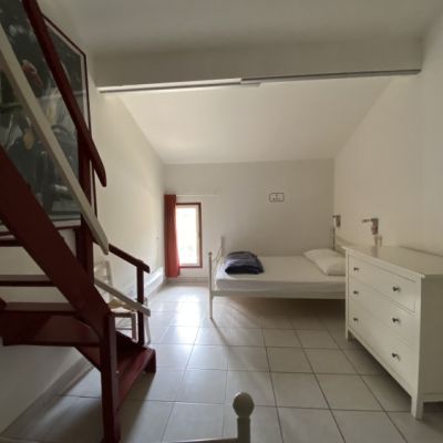 • 1 grande chambre avec 2 lits 2 places et une mezzanine avec un lit 1 place et une salle de bain