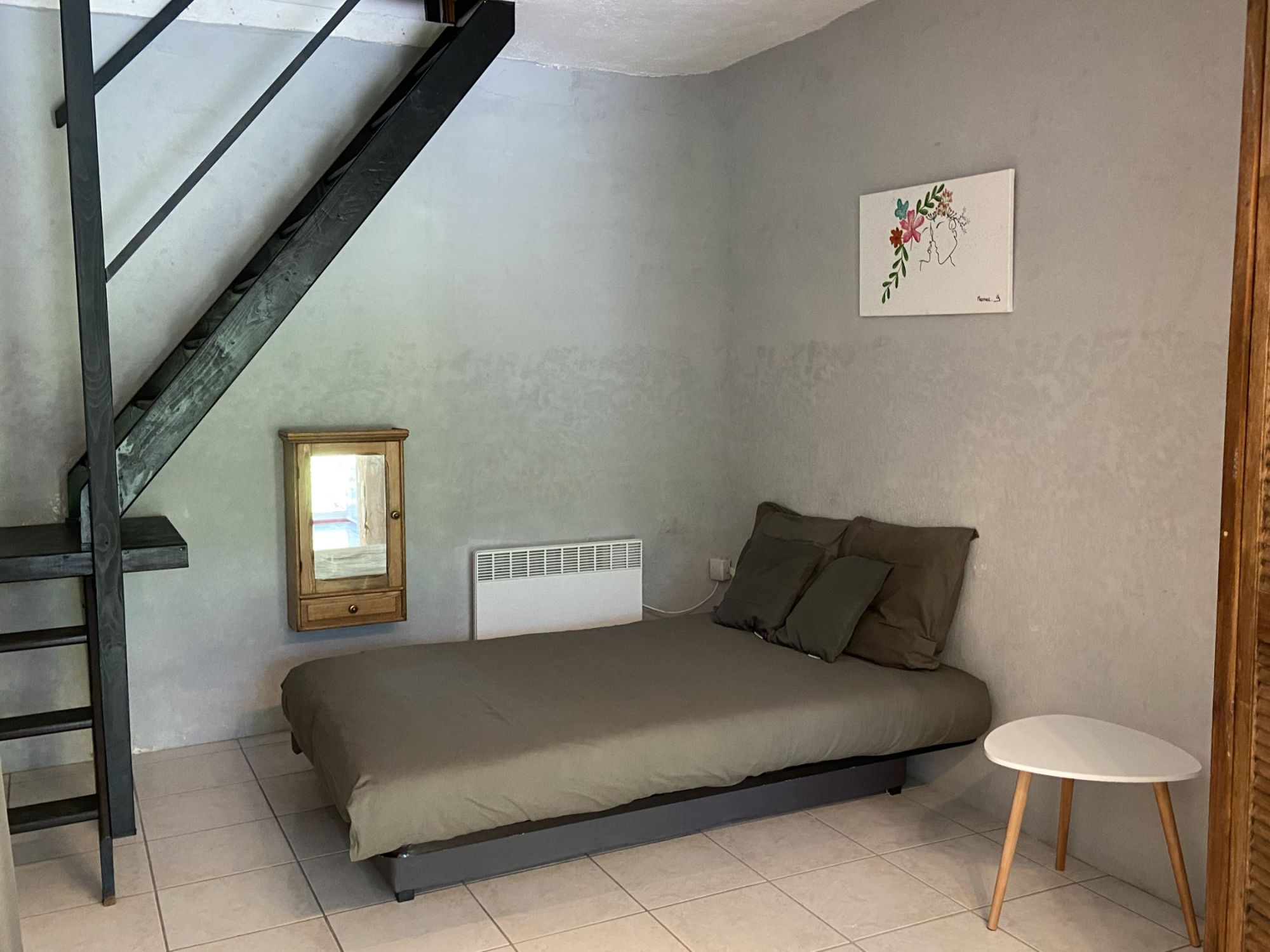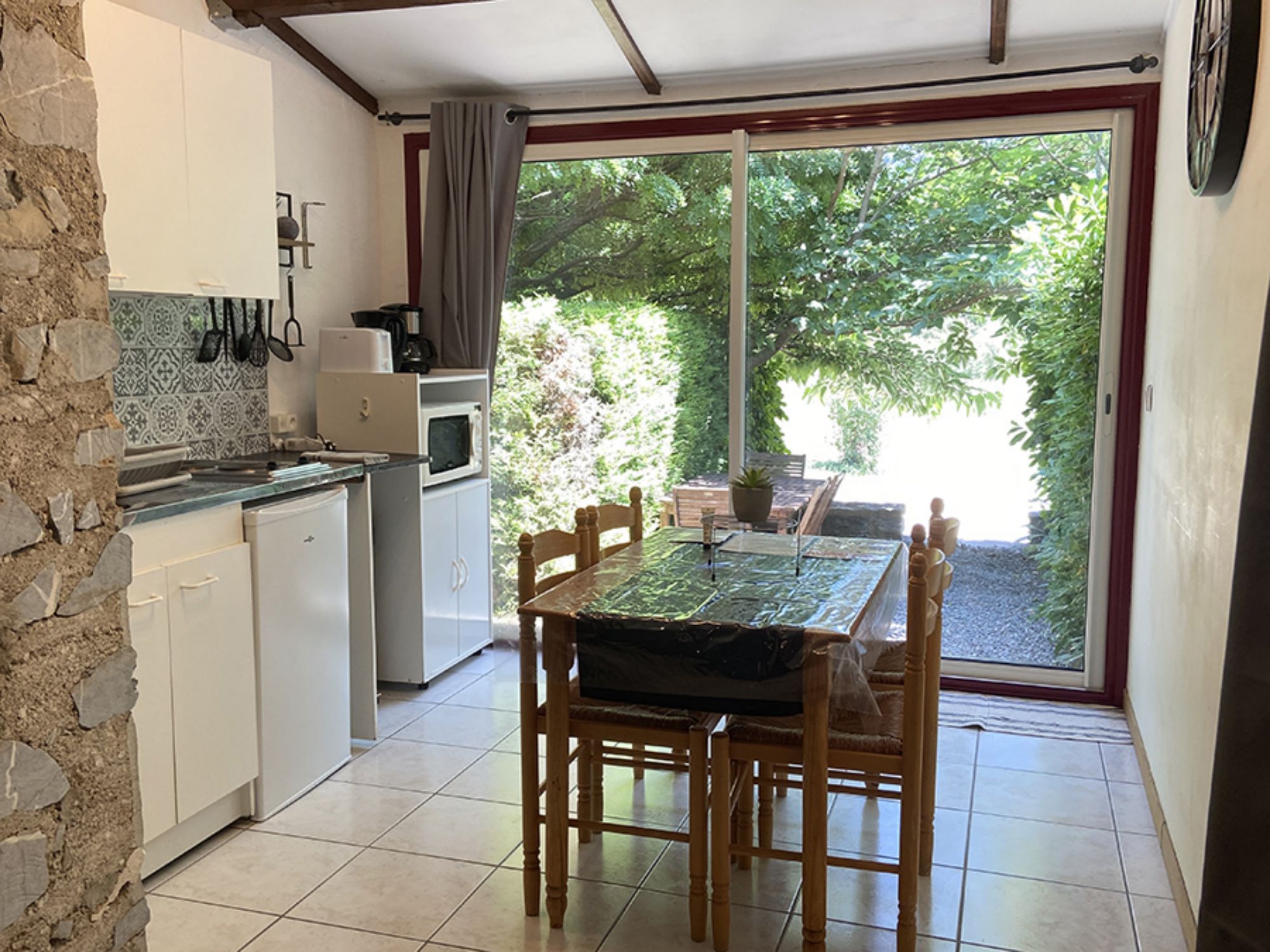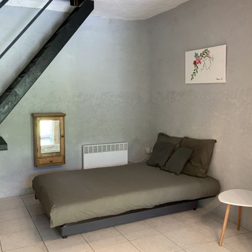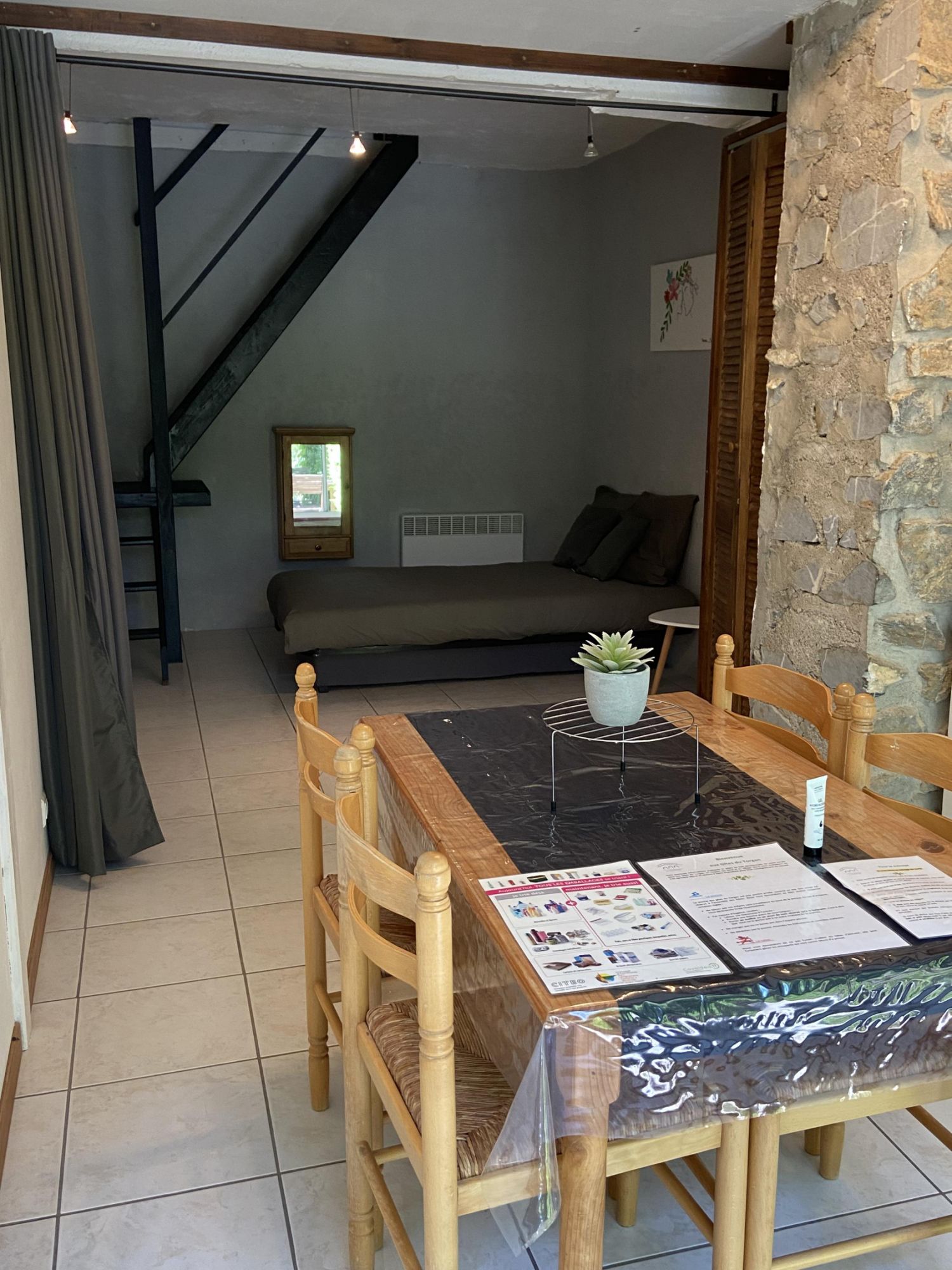 • un salon avec un canapé convertible 2 places (clic-clac), que l’on peut isoler grâce à la tenture
