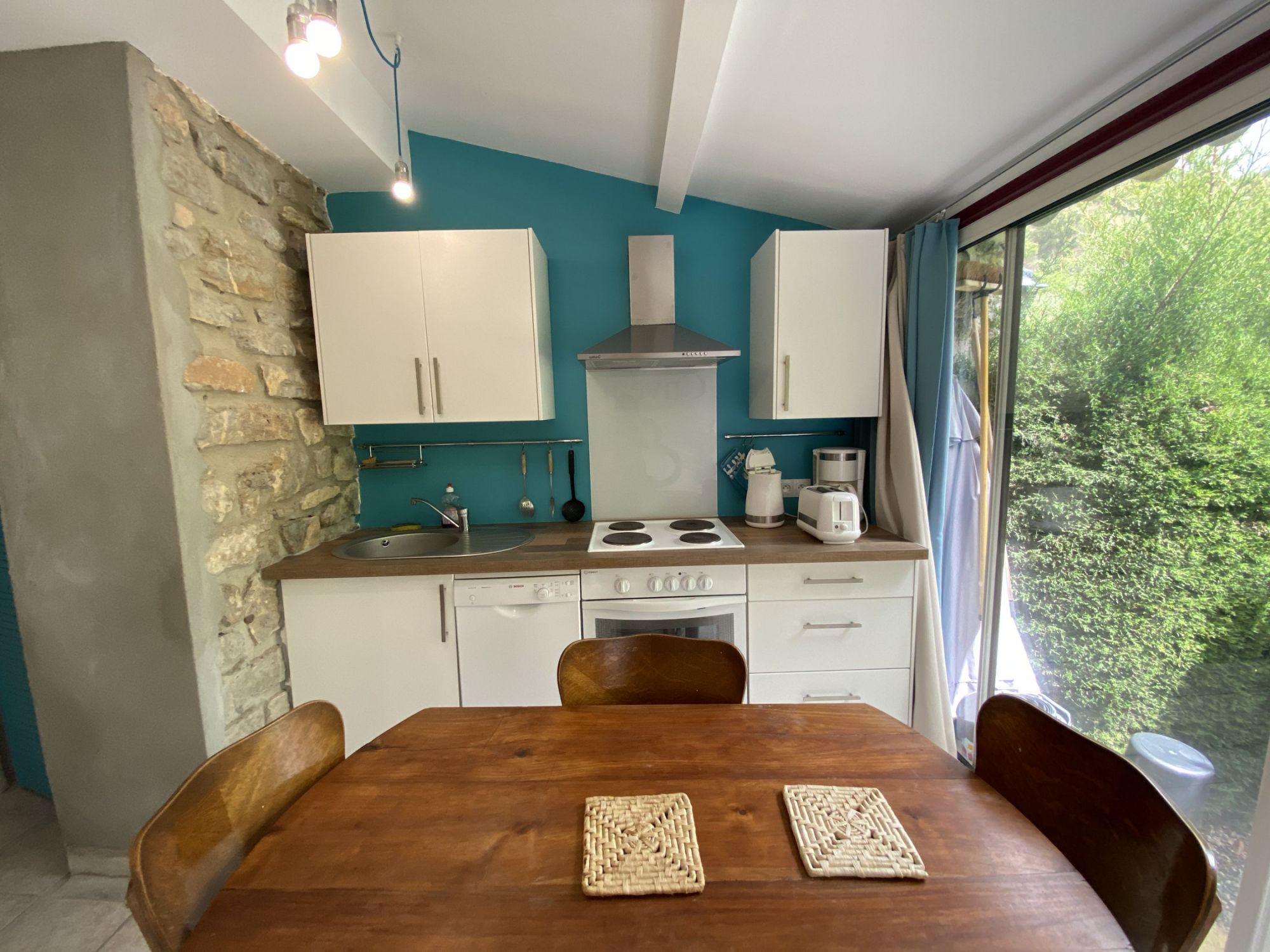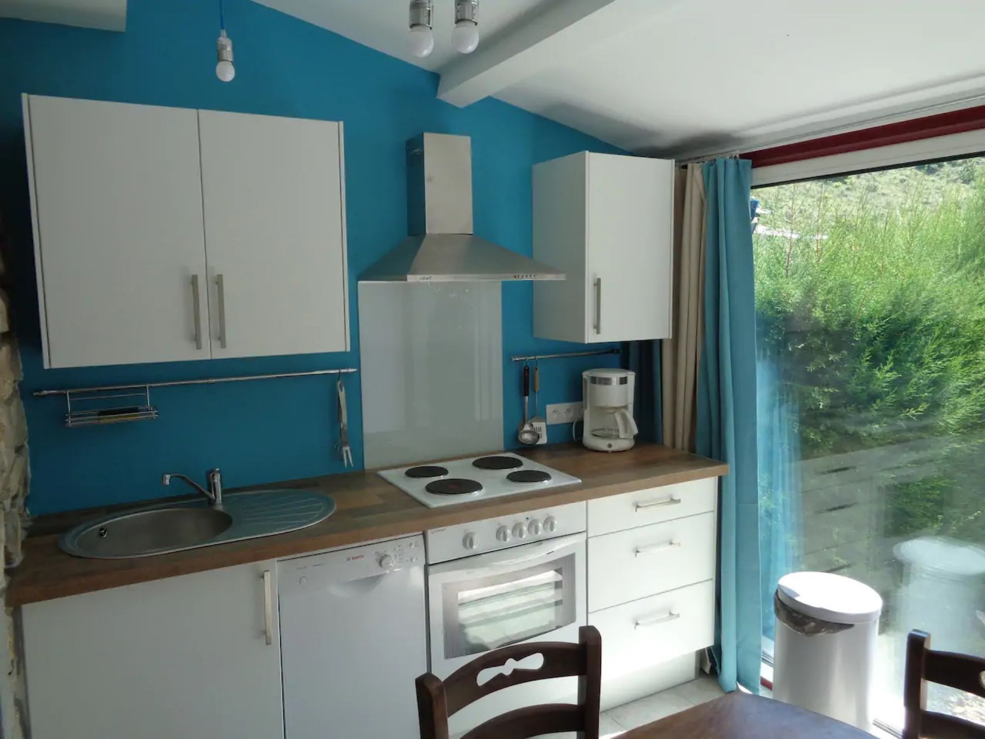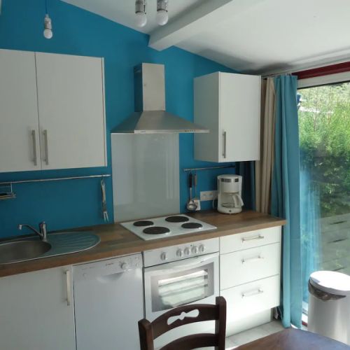 • une cuisine équipée avec un lave-vaisselle, une table de cuisson électrique 4 feux, hotte, four multifonctions, micro-onde, grand réfrigérateur avec compartiment surgélation, bouilloire électrique, cafetière électrique, grille pain, vaisselle et ustensiles de cuisine