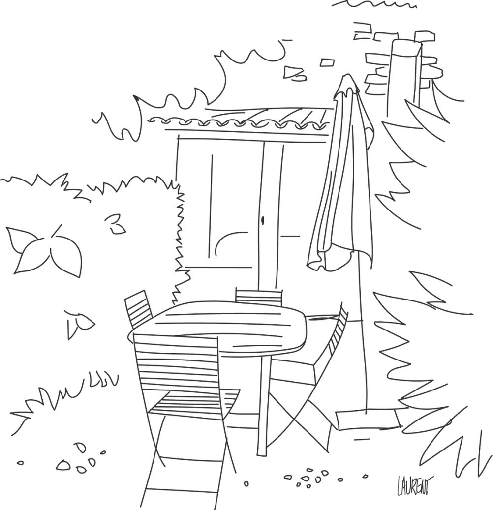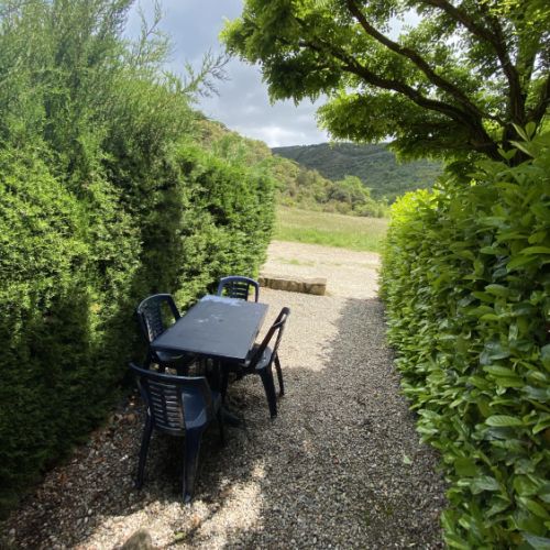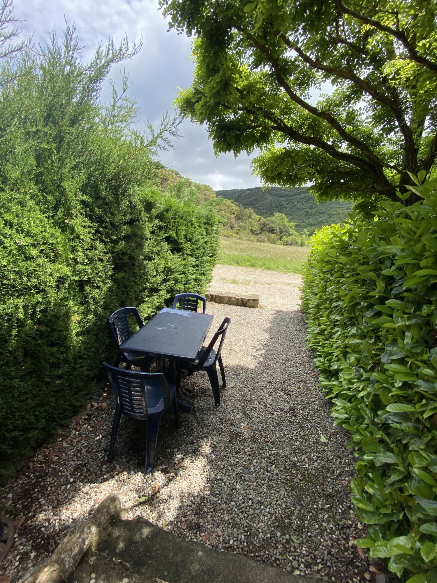 Une vaste terrasse, abritée du vent, orientée à l’Est, avec une vue ouverte sur la garrigue, équipée d’un salon de jardin, barbecue