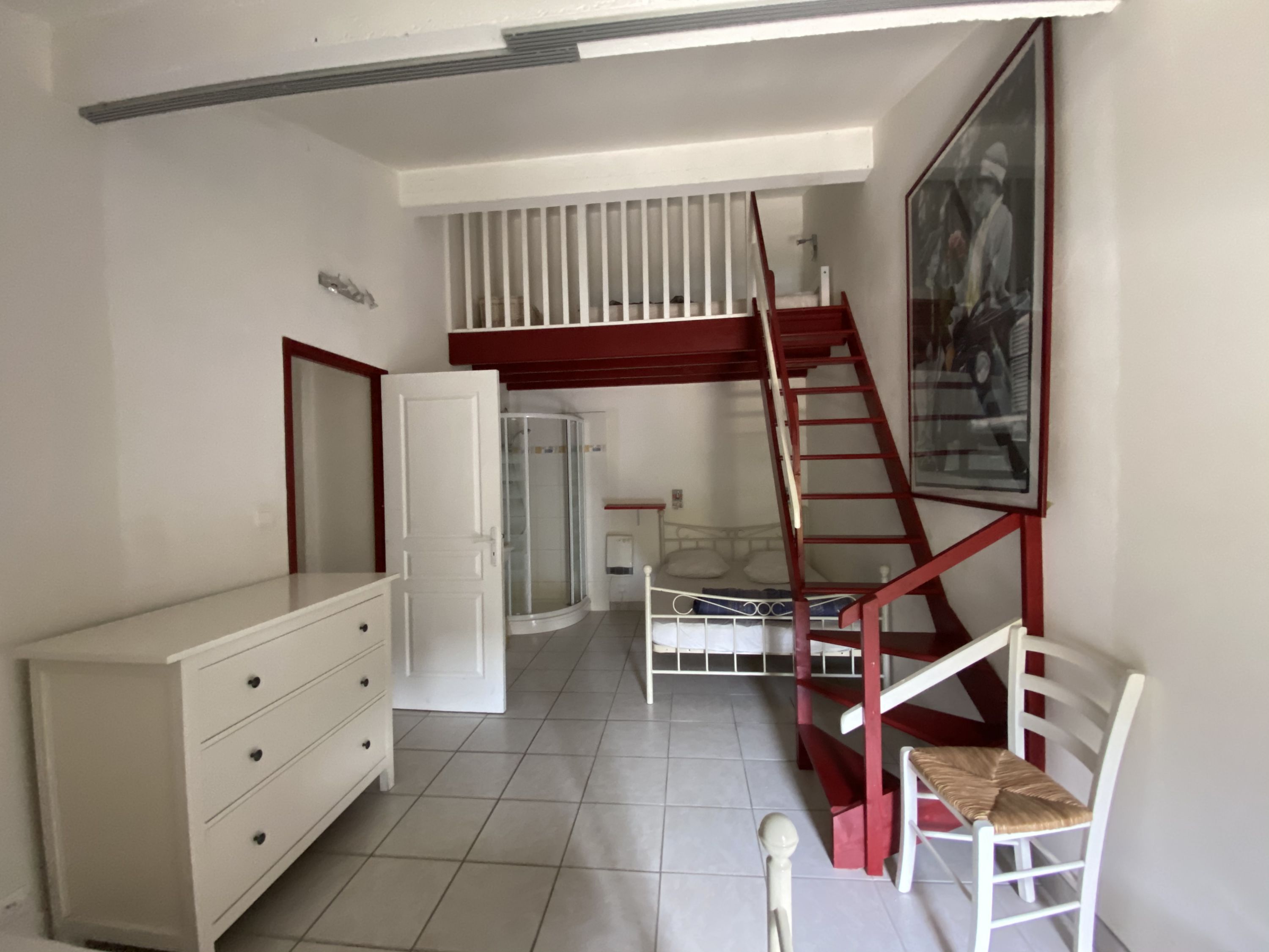 • 1 grande chambre avec 2 lits 2 places et une mezzanine avec un lit 1 place et une salle de bain