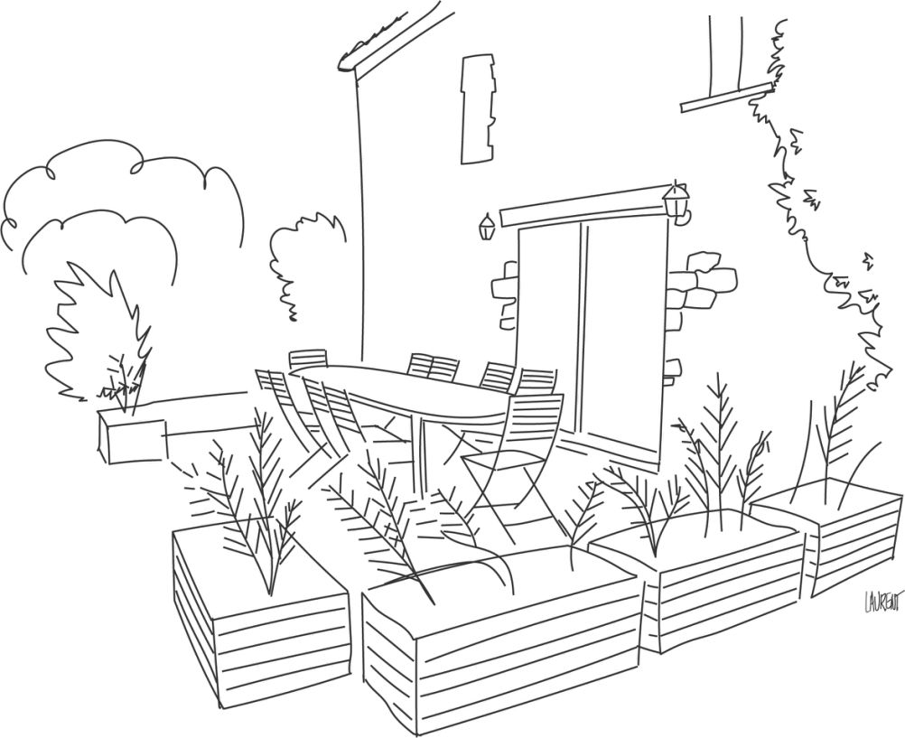 Une vaste terrasse, avec un accès direct à la piscine en saison, équipée d’un salon de jardin, parasol, barbecue